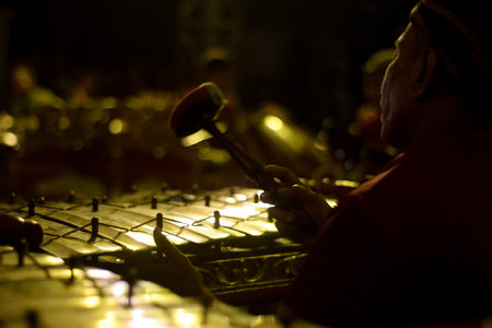 Man playing Gamelan, traditional instrumental from java indonesia at wayang or puppet theatre