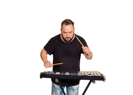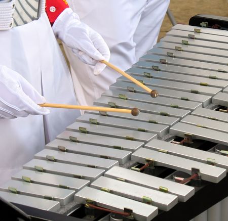 Xylophone concert view of vibraphone marimba player, mallets drum sticks, with latin orchestra musical band performing in the background