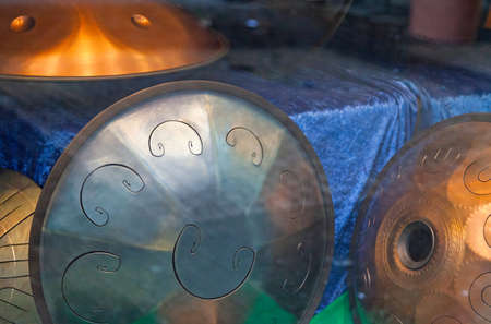 Zurich, Switzerland - June 13 2018: Various handpans on display in the window case of a music store in the city center.