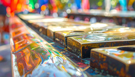 A close-up view reveals a line of objects with a liquid-like, glossy finish, capturing a kaleidoscope of vibrant colors from the blurred background.