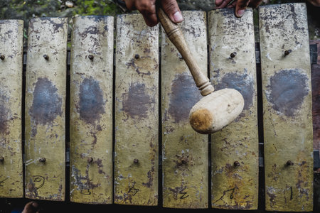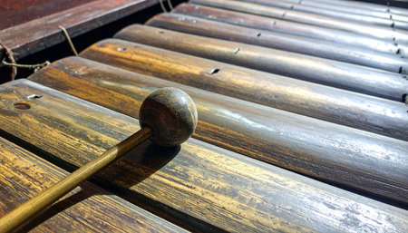 A wooden mallet rests on the aged keys of a traditional gamelan instrument, poised to strike a note.