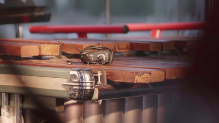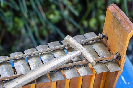 Traditional Balinese musical percussion instrument - xylophone Jegog with hammer, part of orchestra Gamelan. Arts, Music and culture of Bali and Indonesian people and asian travel backgrounds, close up