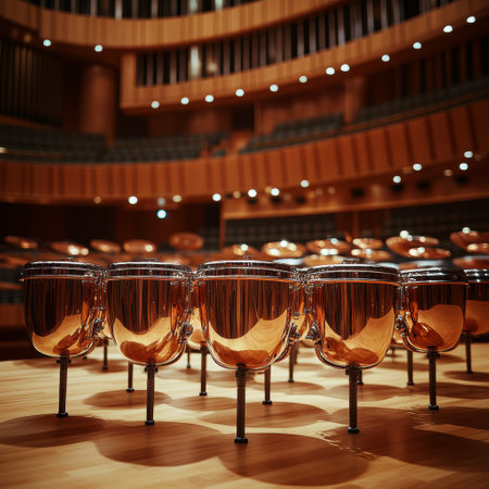 Musician concentrating while playing a traditional asian gong instrument during a concert on stage