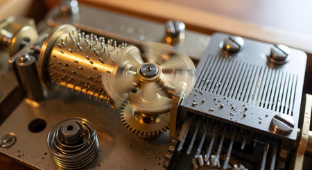 A detailed macro shot of the intricate inner workings of a vintage music box in motion. The golden pinned cylinder rotates, plucking the teeth of the steel comb to create a melody, showcasing precision engineering and nostalgic craftsmanship.
