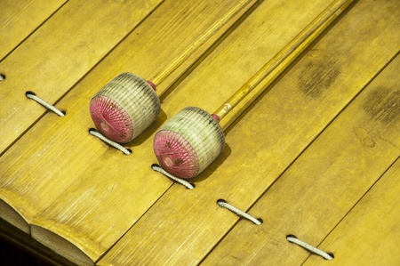 A pair of wooden mallets resting diagonally on the bars of a Thai xylophone