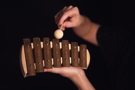 Woman playing a small metal xylophone or glockenspiel with a mallet. Music education and performance concept.