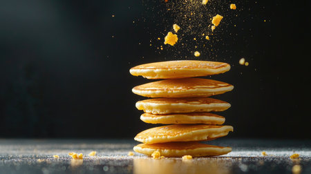 Five pancake stack, illuminated by studio lighting, sugar dust floating, ultra-realistic shadows and textures, deep dark background