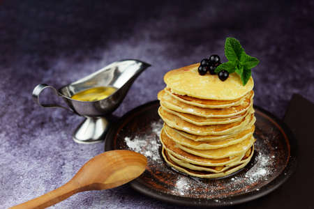 American pancakes on a plate with honey currants berries and a leaf of mint