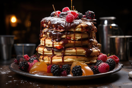 AI Generated. Fluffy Pancakes with Sweet Topping and Berries