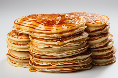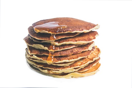 Pancakes with maple syrup isolated on a white background. Breakfast in the morning