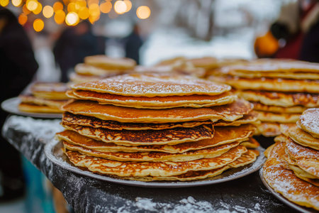 Delicious pancakes are stacked and dusted with flour in a warm kitchen, highlighting the culinary process in an inviting atmosphere.