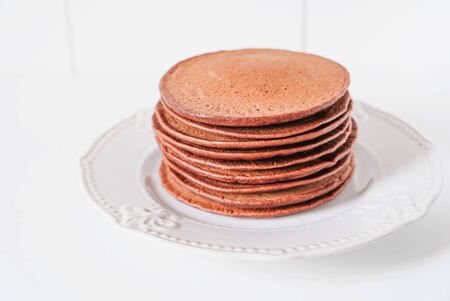 Freshly cooked soft delicious sugar free protein chocolate pancakes stacked on white plate, close up. Space for text. Healthy sweet food.