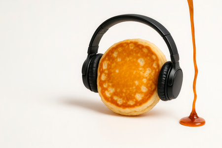 Pancake in headphones listening to music, avoiding syrup. Space for text