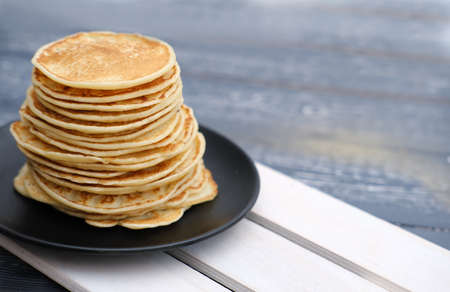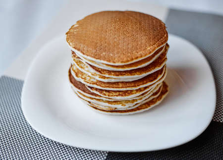 A lot of pancakes are stacked on a white plate. Thin pancakes with a crispy crust. Pancake day. Pancakes for breakfast and carnival. Food background.