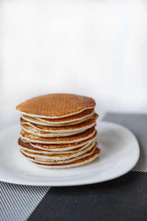 A stack of pancakes is on a white plate, Pancakes on a white plate top view, Pancakes on a white plate,