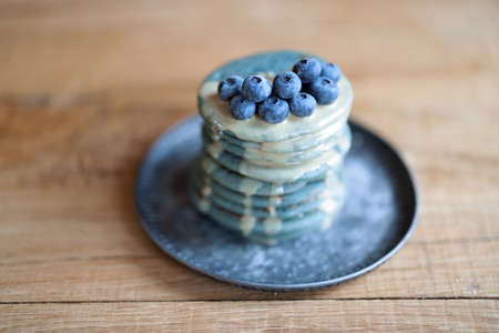 Blue pancakes with blueberry and caramel souse on vintage plate.