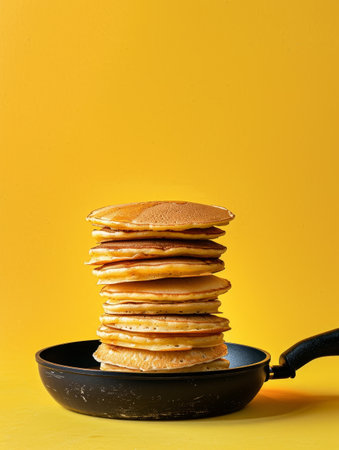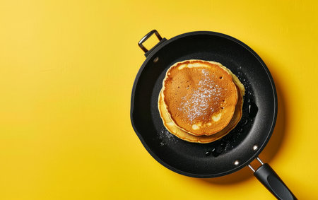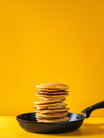 A single, hot pancake glistens with syrup atop a sleek black skillet, the bright yellow background creating a striking contrast