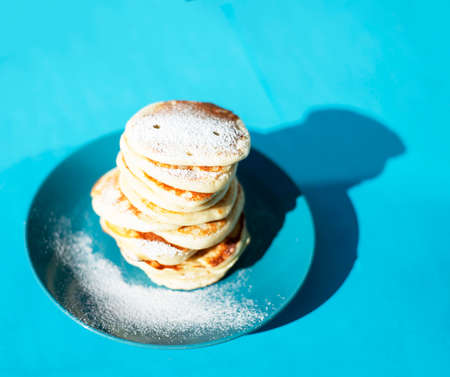 Pancakes are stacked on a plate. blue background. Vivid photography.