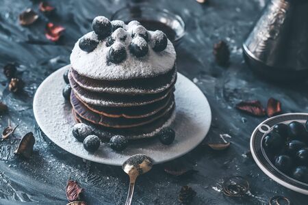 Stack of homemade american ombre chocolate pancakes served on black plate with jug of cream and teapot over black stone texture background.