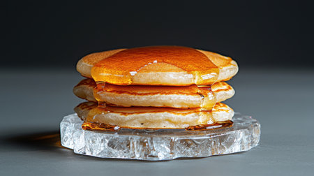 AI Generated. Flying stack of pancakes with syrup dripping on a navy blue background