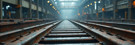 A captivating close-up image of railway tracks within an industrial warehouse, featuring a blurred background. The soft lighting accentuates the depth of field and perspective.