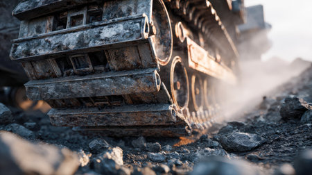 A close-up view of a heavy machinery track system, highlighting intricate metal textures and engineering designs, showcasing the robust components of industrial equipment.