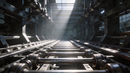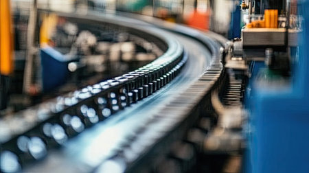 This image captures a close-up view of an industrial conveyor belt, highlighting the intricate design and smooth operation vital for manufacturing processes.