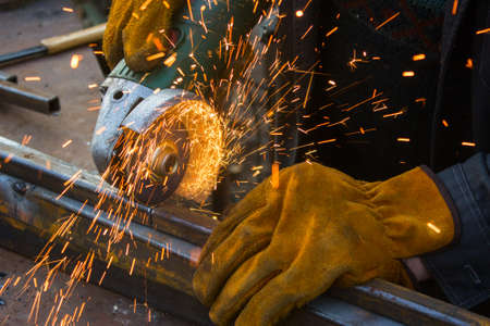Cutting metal with grinder. Sparks while grinding iron. Man in yellow gloves
