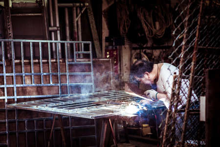 welder is welding metal part in garage. with protective mask, industrial steel welder