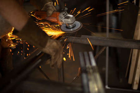 Worker working with a circular grinder on a metal with sparks flying out of them, selective focus