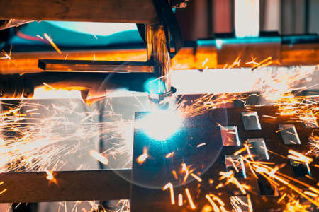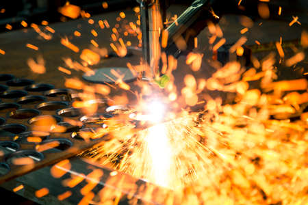 Plasma cutting machine burns through a thick sheet of steel by scattering drops of molten metal in different directions