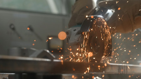 construction industry details - close up of metalworker using disc grinder for cutting metal