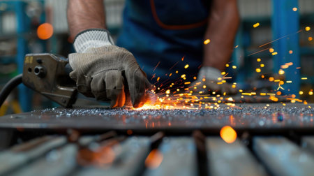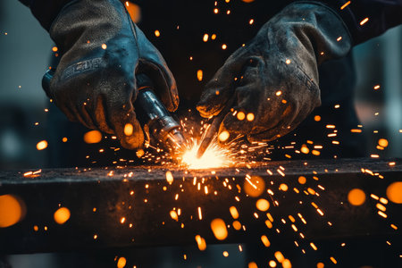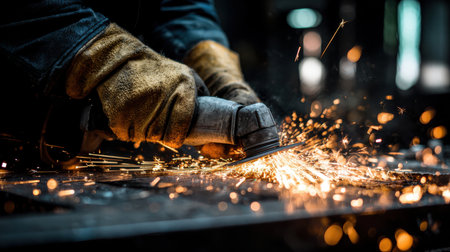 A dynamic close-up captures a craftsman welding metal in an industrial workshop, showcasing flying sparks and the skilled hands of a worker in protective gear.