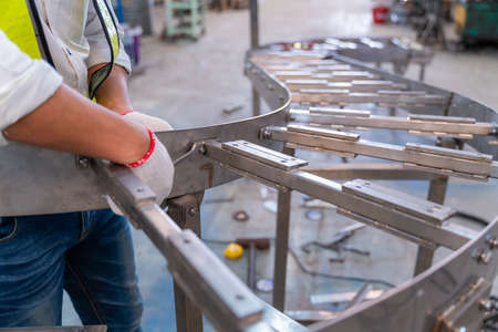 Asian man Mechanic wearing protective mask to Protect Against Covid-19,male technician worker working and Assemble the product sorting machine conveyer in a large industrial factory.