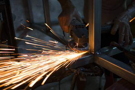 Worker man using electric wheel grinding and cutting on steel structure have spark from the grinding wheel at production industrial