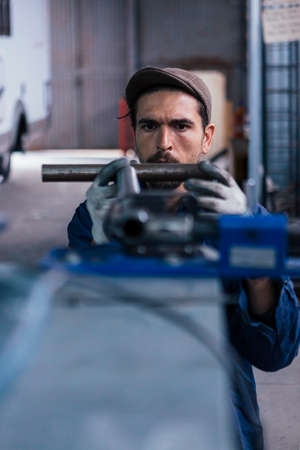 Busy man is working at his workplace at the metal factory.