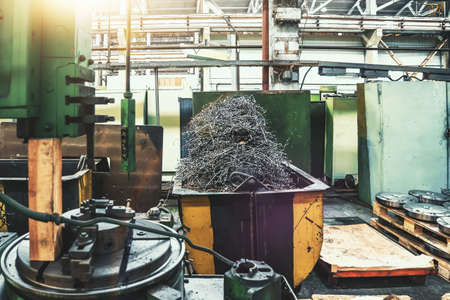 Metal shavings scrap metal waste in steel container in metallurgical factory.