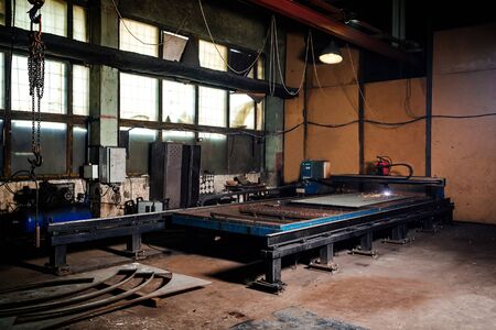 Steel factory production line, flame cutting machines and workers at work.