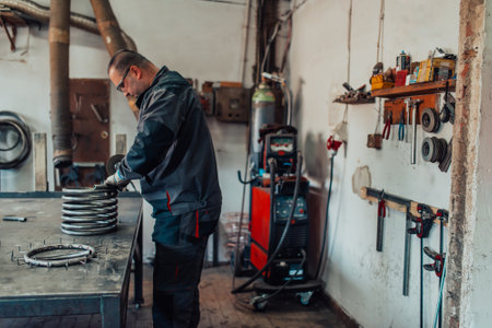 Bearded mechanic cuts steel car part with an angle grinder in a garage.