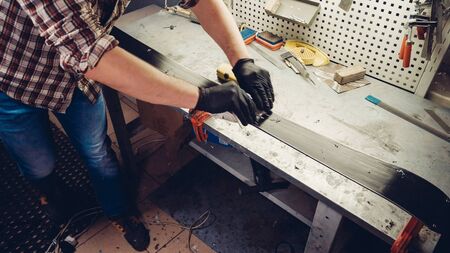 Ski maintenence. Removing excess wax from race ski base plastic scraper. Ski service and repair. Winter shop worker doing base repair. Rental workshop service. Repairman In Workshop Ski Service.