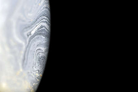 Abstract closeup soap bubble, like gray alien planet in universe on dark background