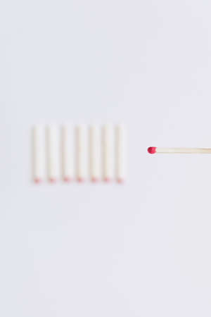A row of matches with one lit match in the middle. Concept of a single match being able to ignite a whole row of matches