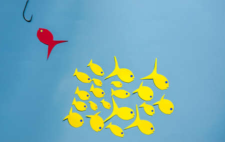 paper yellow and red fish on a blue background