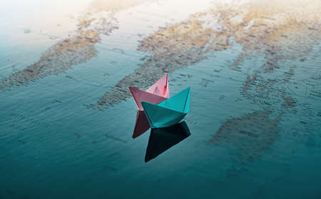 Two paper boats of pink and blue color, float on the water. Under the water you can see a map of the world on which the continents are depicted.