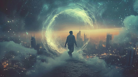 A man stands illuminated against a backdrop of swirling stars and vibrant colors, representing a fusion of inner peace and cosmic energy at dusk.