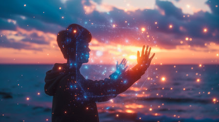 An individual seems to harness cosmic energy, with a vibrant display of stars and nebulae against the ocean sunset backdrop.