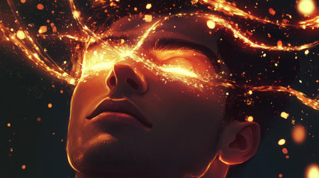 A man's face radiates with glowing comets darting across his forehead, their luminous trails merging with his introspective expression, evoking a sense of wonder and contemplation.