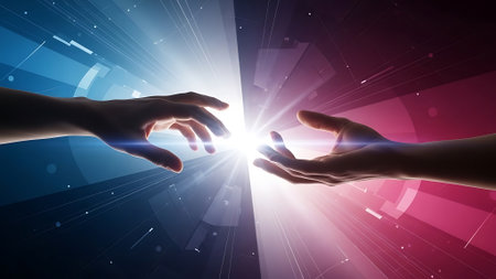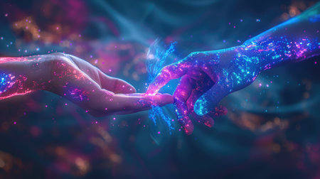 hands interacting to touch each other in adam's creation style with neon lighting. 3d rendering