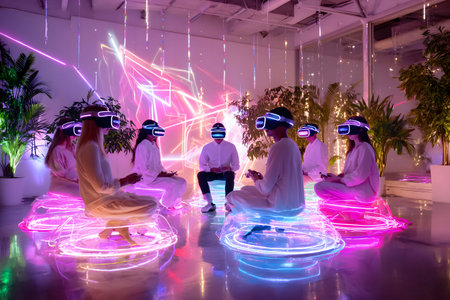 Diverse group wearing VR headsets engaged in virtual collaboration in a neon-lit environment. Great for metaverse, tech, and remote work themes.