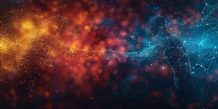 An abstract digital illustration featuring two hands reaching out to connect, composed of interconnected dots and lines against a dark blue background.